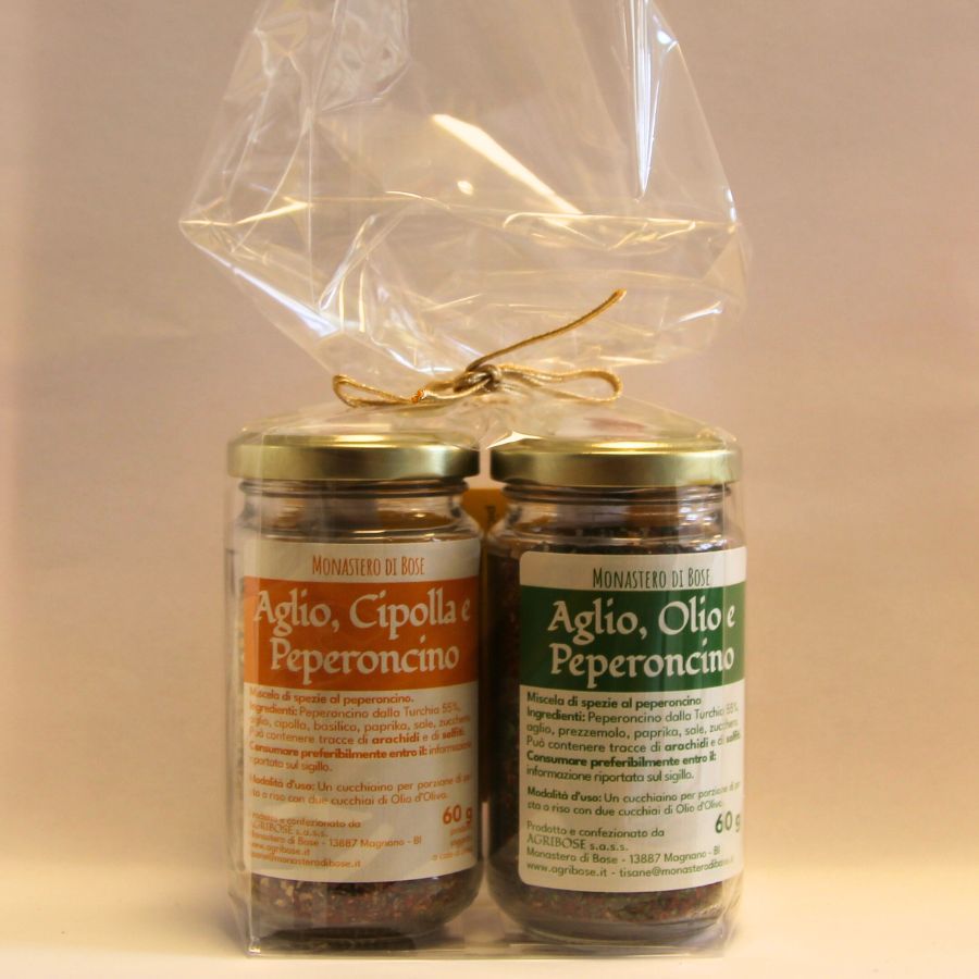 Una confezione regalo con due preparati utilissimi in cucina: Aglio olio e peperoncino; Aglio, cipolla, basilico e peperoncino. All'interno un piccolo ricettario per utilizzarle al meglio e con creatività.